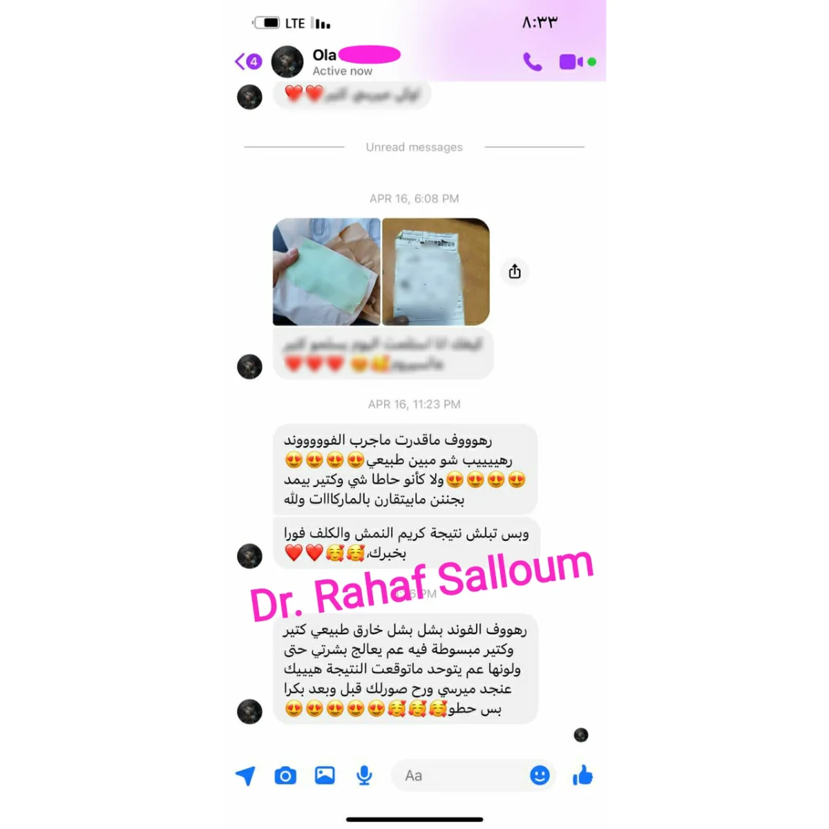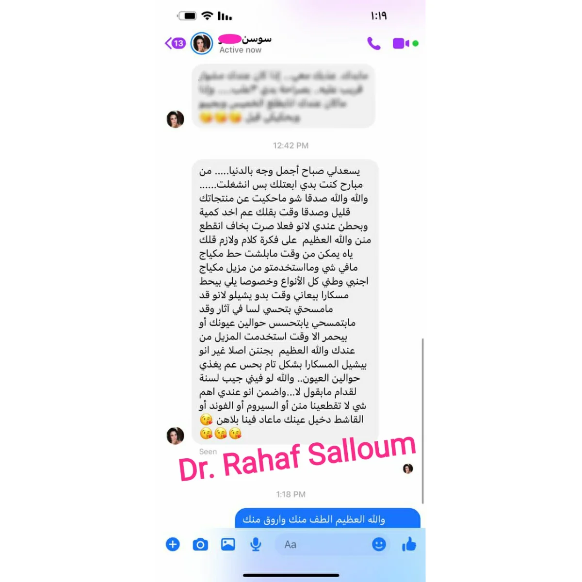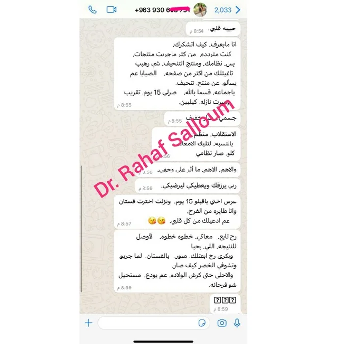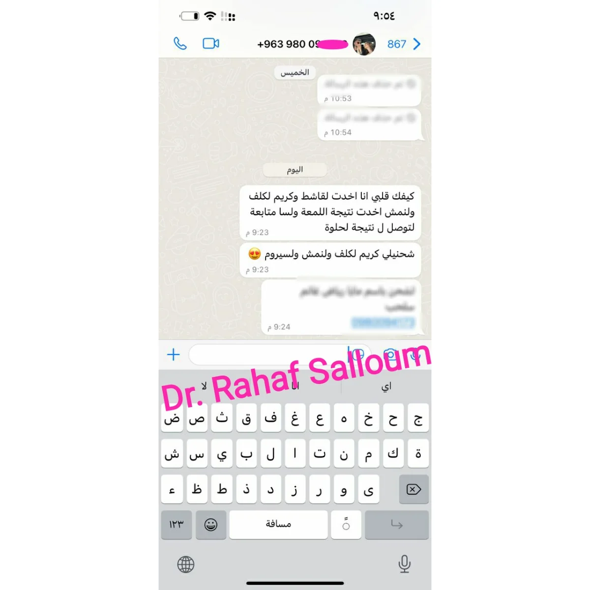 منتجات طبيعية أصنعها بيدي وبخبرتي، باستخدام مواد مختارة بعناية جدا ، وتحت إشرافي المباشر أنا الدكتورة رهف زهير سلوم، صيدلانية وأخصائية عناية بالبشرة لطلب المنتجات مباشرة بدون استشارة اضغط هنا اما لطلب إستشارة مجانية بالكامل يتم تعبأة الاستبيان ليتم التواصل معك و معالجة حالتك. الاسم *اسم الاب *اسم العائلة *رقم الواتساب للتواصل *تحميل صورة بدون فلاتر و بدون مكياج *اختر الصورةلم يتم تحميل صورةDelete uploaded fileتفاصيل الحالةارسال الاستشارة منتجات العناية بالبشرة روتين البشرة الدهنية 160.000 ل.س أضف الى السلة غسول البشرة بالكولاجين 60.000 ل.س أضف الى السلة غسول لاكتيك اسيد 60.000 ل.س أضف الى السلة كريم الشد 150.000 ل.س أضف الى السلة كريم الكلف المعند 3 250.000 ل.س أضف الى السلة خلاصة الأوليفيرا للترطيب والأكزيما 75.000 ل.س أضف الى السلة روتين البشرة الدهنية 160.000 ل.س أضف الى السلة غسول البشرة بالكولاجين 60.000 ل.س أضف الى السلة غسول لاكتيك اسيد 60.000 ل.س أضف الى السلة كريم الشد 150.000 ل.س أضف الى السلة كريم الكلف المعند 3 250.000 ل.س أضف الى السلة خلاصة الأوليفيرا للترطيب والأكزيما 75.000 ل.س أضف الى السلة منتجات العناية بالشعر كرياتين طبيعي أضف الى السلة خلطة السبع زيوت 100.000 ل.س أضف الى السلة بديل الزيت 100.000 ل.س أضف الى السلة بخاخ تطويل الشعر 60.000 ل.س أضف الى السلة مجموعة العناية بالشعر 260.000 ل.س أضف الى السلة كرياتين طبيعي أضف الى السلة خلطة السبع زيوت 100.000 ل.س أضف الى السلة بديل الزيت 100.000 ل.س أضف الى السلة بخاخ تطويل الشعر 60.000 ل.س أضف الى السلة مجموعة العناية بالشعر 260.000 ل.س أضف الى السلة منتجات الميكاب الطبي جل رموش 65.000 ل.س أضف الى السلة جل حواجب 50.000 ل.س أضف الى السلة مزيل مكياج 50.000 ل.س أضف الى السلة مورد الخدود والشفاه 40.000 ل.س أضف الى السلة برايمر 60.000 ل.س أضف الى السلة فوند طبي واقي من الشمس 150.000 ل.س أضف الى السلة جل رموش 65.000 ل.س أضف الى السلة جل حواجب 50.000 ل.س أضف الى السلة مزيل مكياج 50.000 ل.س أضف الى السلة مورد الخدود والشفاه 40.000 ل.س أضف الى السلة برايمر 60.000 ل.س أضف الى السلة فوند طبي واقي من الشمس 150.000 ل.س أضف الى السلة آراء و النتائج